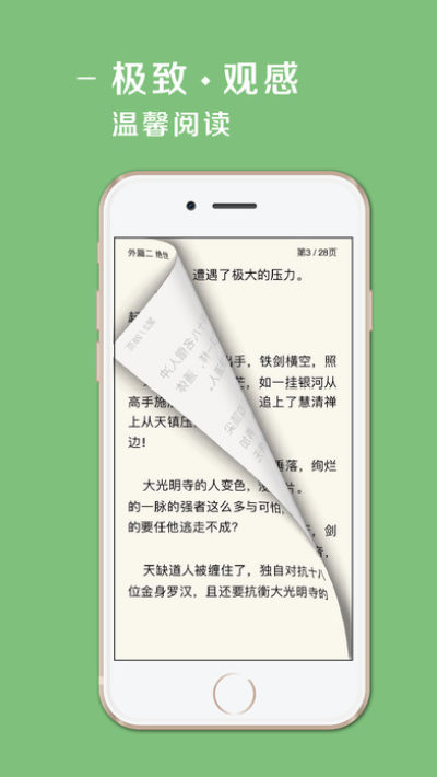 精致的阅读界面。柔和的书页纸张,多种颜色切换阅读。记忆阅读,翻页,选章节功能,灵活调整背景亮度、行间距/页边距/段间距等。