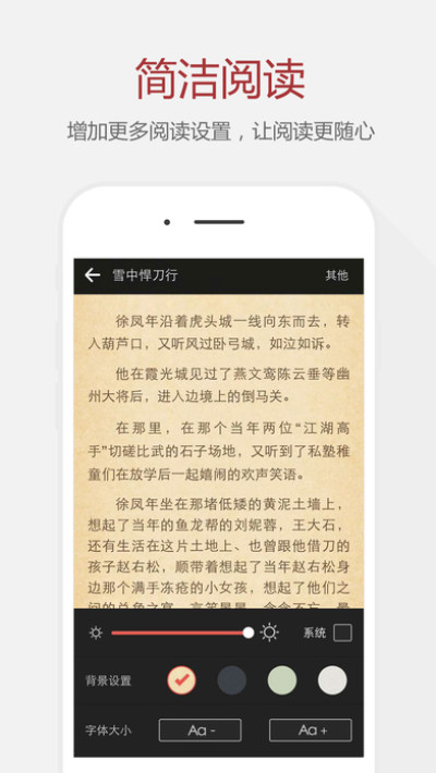 3、全屏阅读、自动滚屏、侧键翻页、目录浏览、书签收藏、智能记忆上次阅读位置;