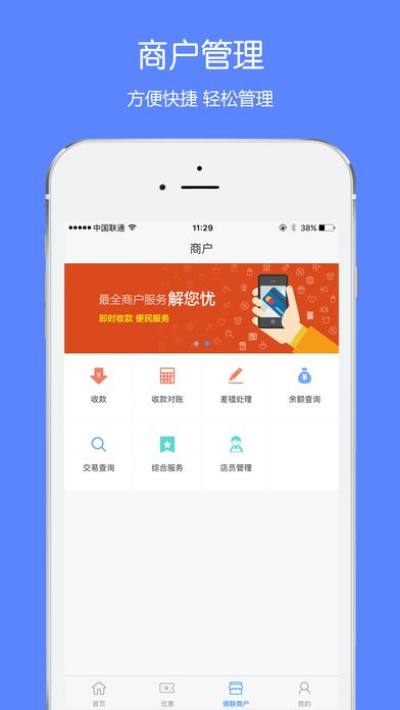 3、为银联商户提供刷卡收款、交易查询,交易通知,店员管理等商户优质服务