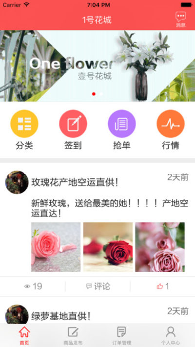 1号花城商户端APP致力于帮助批发商解决出货难题,打造精品店铺,发布花卉信息,进行在线交易。你的花卉你来掌握。首页抢单手指轻轻一点快速拿下求购单,行情展示实时了解花卉市场最新动态.