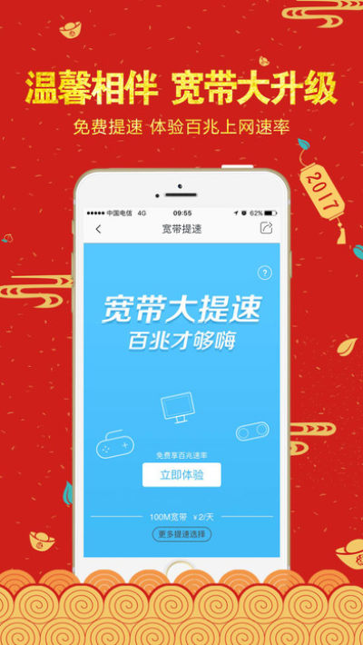 全面支持免费提速、一键续约、网络测速、免费体验电信百兆宽带,让你足不出户享受宽带服务!