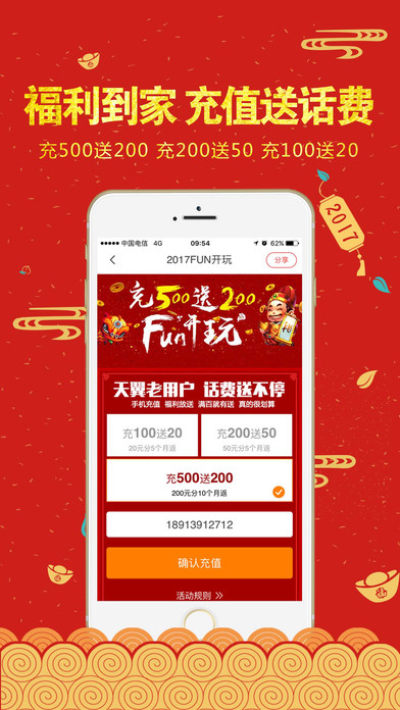 支持实时手机、固话、宽带快速话费充值,最高充500送200,便捷安全无需排队等待;