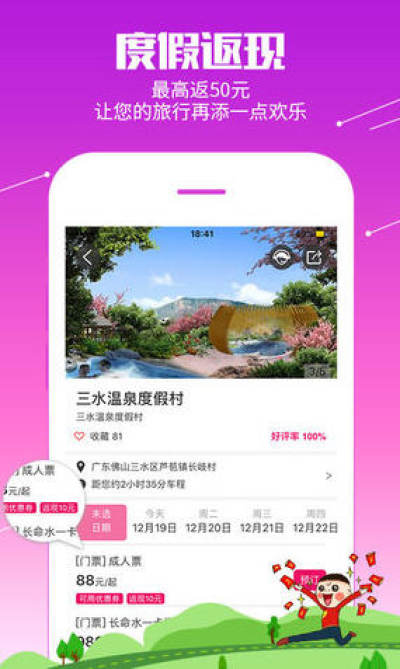 放假周边游app最新版是一款专注城市白领周末生活方式的在线旅游APP,提供周末的一种全新的生活,亲子路线、单身路线、情侣路线、父母老年路线等专线服务的推出,提升消费者的周末生活品质。专注周末、周边度假酒店、门票、酒景组合的定制游玩套餐服务。现已覆盖城市周边温泉、主题乐园、农家乐、海边度假、周边特色酒景搭配等。