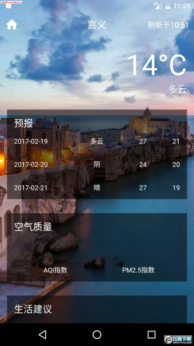 预报信息——24小时天气及温度预报;未来天气信息及趋势对比;支持2486个国内城市区县和676个国际城市。