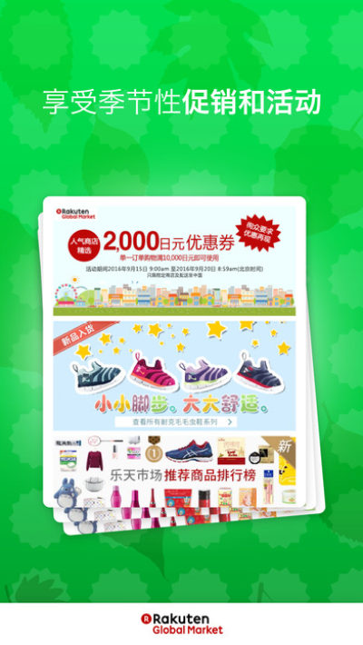 您是否有乐天 ID?如果没有,您可以立即在应用程序中免费创建一个。根据乐天独家会员奖励计划,每次购物均可赢取乐天超级积分!您可使用乐天超级积分在未来购物时获取折扣。我们还会开展季节性促销和趣味购物活动,您可享受巨大优惠。一定不要错过!享受从众多市场购物的乐趣,只需一个应用程序!