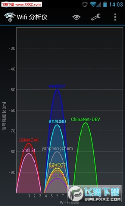 进入软件,首先就能看到一个wifi信号的图表,一个坐标图,wifi信号由一个弧线显示出来,不同的wifi会用不同的颜色显示出来。弧度越高的,说明该wifi接入点的信号也就越强,越容易连接。