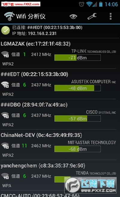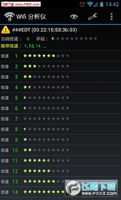 wifi分析仪最新去广告版可以帮助用户随时随地连接周边免费WiFi热点,此外还可以显示出周边WiFi网络使用情况,多视图分析表现只需滑动屏幕即可切换,建议按照软件的建议给路由器选择一个星级高的信道使用即可!