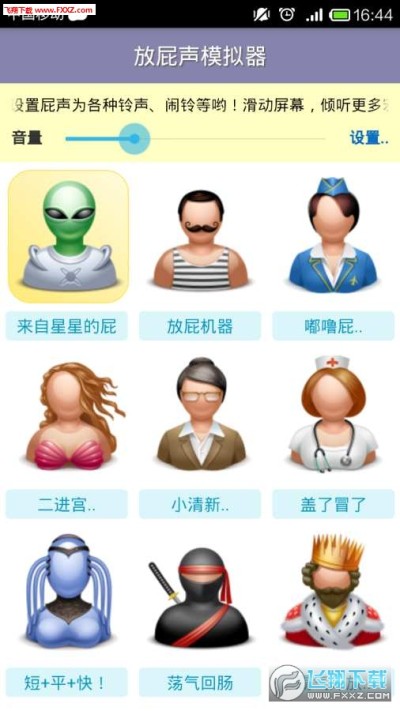 放屁模拟器,可以模拟各种情况下的屁声,非常的搞笑,并真心欢乐,来自星星的屁、嘟噜屁……在足球场,BUS或地铁上的拥挤情景下,放在兜里的APP突然放出各种屁声,大家会立刻腾出宽松的位置……