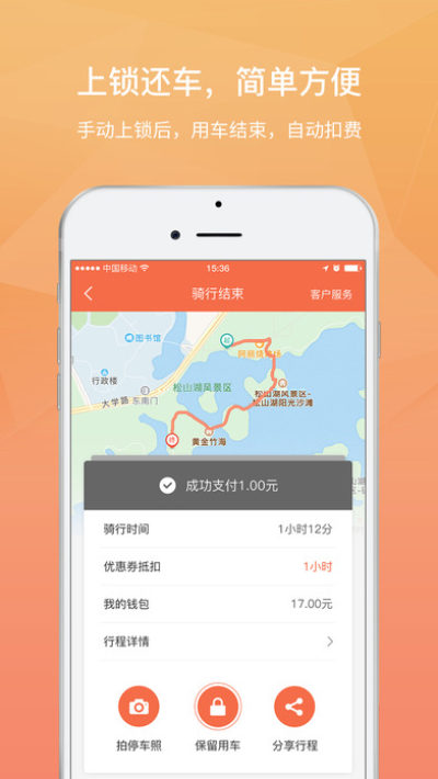 手动关闭智能车锁,即可结束用车,自动支付单车费用