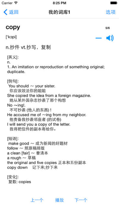 2.每个单词都配有大量的英文解释,例句,短语,近义词,反义词,时态变化等详细解释,而且可以单独显示英文解释,例句,短语和词义缓出等功能。