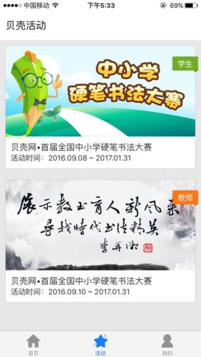 网壳网.贝壳活动APP,由湖南教育出版社官方出品。汇聚全国中小学师生各项活动信息,建造全国中小学师生活动网上平台。以贝壳网帐号为基础,区分教师与学生,提供针对性的专属活动资讯。