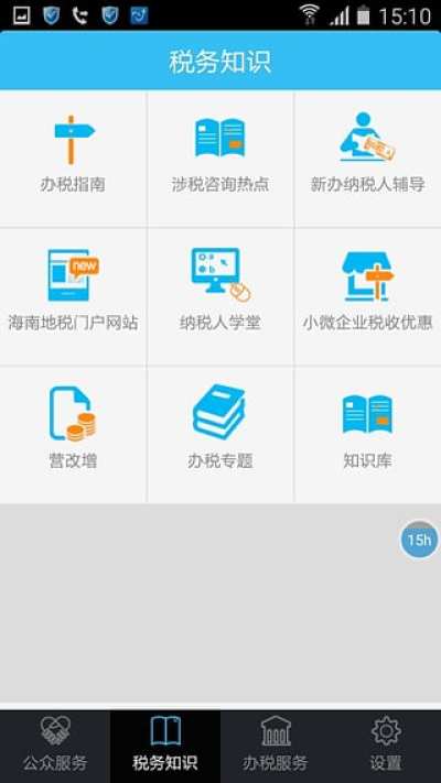 “海南地税APP”苹果版界面采取人性化设计,简洁明快,并设置有“公众服务”、“税务知识”、“办税服务”、“设置”四个功能,主要为纳税人提供“零申报”、已缴纳税款查询、未申报信息查询、办税事项二维码告知、办税地图、法规库、大厅等候人数等3类25项涉税服务,并支持企业办税和个人办税,纳税人可第一时间获知税收新政,搜索到最新法规,随时随地查询涉税信息、咨询税务问题。
