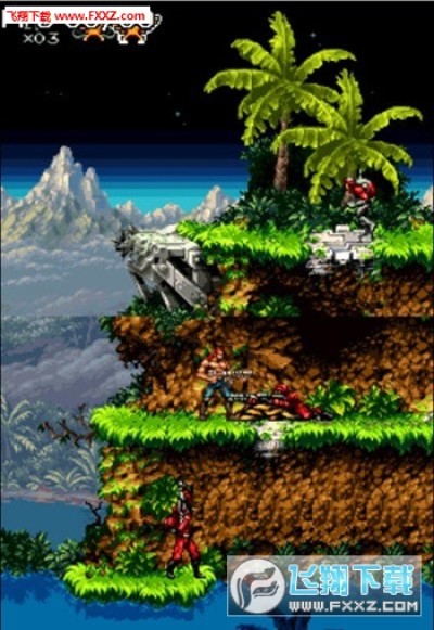 再往前走就遇到了本作的新系统——锁链 在看起来可以挂住的地方的正下方按U键即可用锁链吊上去 以后的攻关中小心一点 吊的锁链上后有一段硬直的时间 不能攻击也不能移动 过桥 桥上飞过的M弹拿好 这样就有了2级的M弹了 攻关会轻松不少 这作的桥不像初代一节一节爆炸 而是有一个炸弹兵吊在桥上把桥炸毁 可以消灭 消灭后桥就不会被炸掉了 锁链吊到悬崖上 继续前进 解决一只趴下的兵后又见大桥 用你的S弹右下走打可解决大部分杂兵 2层的一个地炮可以无视 走过桥 可以吃到一颗炸弹 屏幕内杂兵全部死光 注意吃之前屏幕往右移一点 顺带炸掉底下的小炮 按下+跳即可跳下悬崖 拿到第二个S弹 这样 子弹成型 之后不要走水路 会和很多跑步兵照面 上了一个大坡后杂兵骤然减少 玩家可不能放松 小心有开枪的小兵暗算