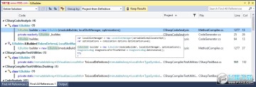 查找所有引用 (Shift+F12) 也已经过重大改进 (目前仅支持 C#, Visual Basic, 和 C++),提供高级分组,过滤,排序,在引用结果中搜索以及高亮结果(适用于 C# 和 VB),所以你可以清晰理解你的引用,并获取所需的代码行。在鼠标悬停在引用的项目上时,会有一个悬浮提示,其中包含源代码中的引用上下文(适用于 C# 和 VB)。通过切换工具栏中的保持结果按钮,下一次调用查找所有引用将在新窗口中填充引用结果。这允许你在当前窗口中保留当前结果。