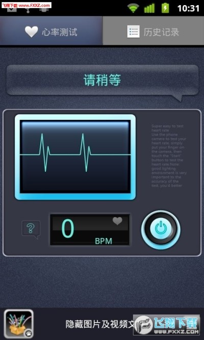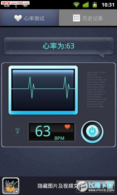 《心率测试器app官网版》这是一款专门用来测试心跳的软件,这款软件体积非常轻小但是用起来还是非常有意思的,使用方法也非常简单,软件为你准确的测量出你的心跳频率,也是对你自身健康的保障,感兴趣的朋友快来下载体验吧!