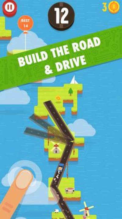 游戏时我们的车辆会沿道路自动直线行驶,玩家要在道路转到可以连接两座小岛的恰当位置时点击手指,搭建通路连接岛屿避免车辆坠毁。