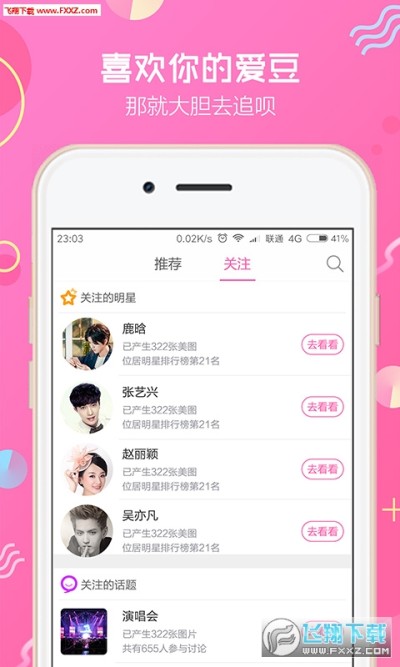 追呗APP是一款粉丝必备的手机应用软件,内有丰富的明星图片,搞怪卖萌自拍照应有尽有,还有实时的爱豆动态消息,及时了解偶像的微博、INS消息,简单的打榜应援,帮助自己的偶像让更多人知道,有需要的朋友们快快来下载使用吧~