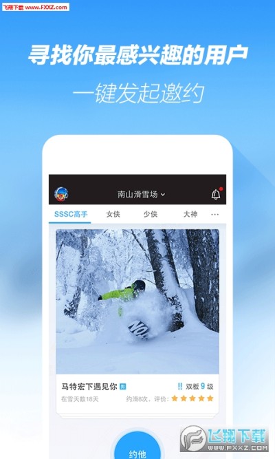 通过滑呗约滑匹配,可以在雪场发现有趣的雪友、知名的达人,并邀约他们一起开心滑雪。