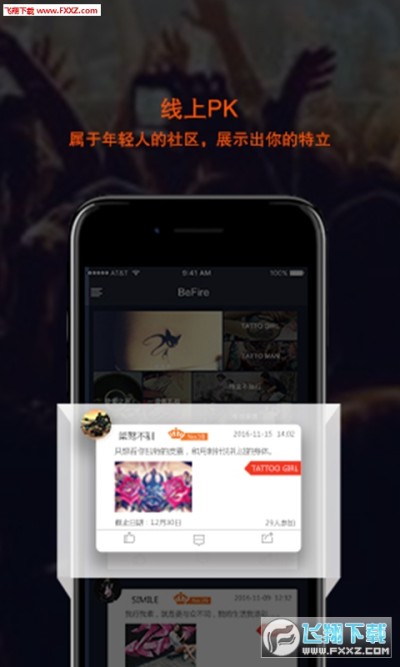 BeFire锋伙汇集国内领先的先锋街头文化聚会、社交、资讯为一体,满足你在livehouse、演出现场、夜店(mix、mao、愚公移山等)等现场活动的同城交友需求。