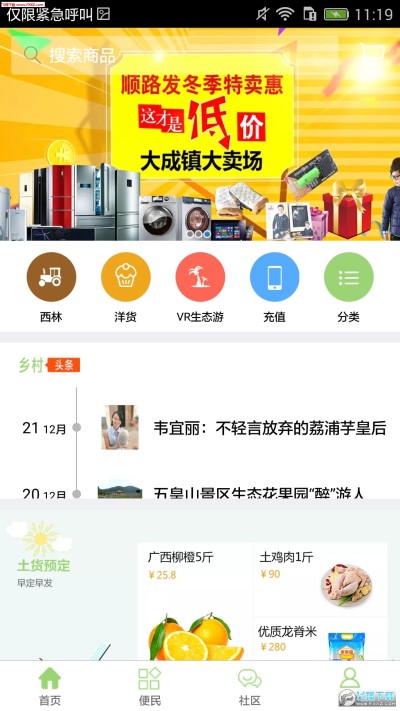 【商城】 商城模块具备商品搜索、浏览、商品购买,在线支付,订单查询,物流跟踪等功能。为用户打造简单、快乐的生活体验。特色频道:一村一品、私人定制。