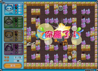双人模式:玩家1:键盘WASD键控制角色移动,空格键炸弹;玩家2:方向键↑↓←→控制角色移动,Enter键放炸弹。