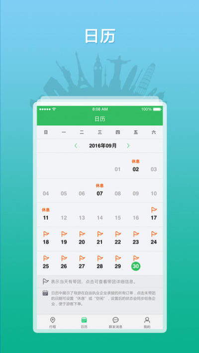 日历:展示了导游在自由执业企业承接的所有订单,点击未带团的日期可设置“休息”或“空闲”,设置后的状态会同步给各企业,便于游客下单。