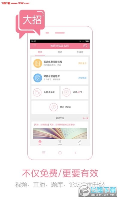 教师撩妹,考试无罪 2017全新课程全新体验全面来袭! 教师资格证考试、招聘考试将免费进行到底^~^ 直播课也可以在后台播放啦~~~ 再也不用担心赶不上直播老师的精彩讲解 300万教师笔试考生、100万面试考生、200万普通话考生, 10000+全国教师考生用户五星好评; 教师资格证、招聘考试涵盖:幼儿、小学、初中、高中,全部笔试科目:综合素质、教育知识与能力+面试+普通话测评 四大功能模块: