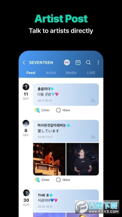在Weverse上创建粉丝帖子并分享您喜爱的明星的精美照片。