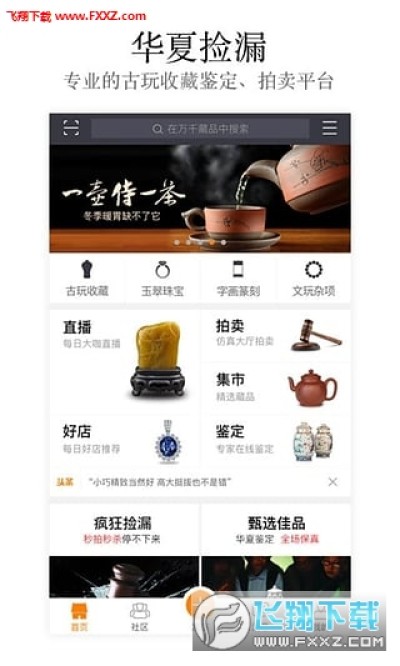 华夏收藏网、华夏捡漏、华夏微拍,是华夏收藏为广大古玩、文玩、艺术品等玩家搭建的集网站、手机、微信朋友圈等为一体的交易、交流APP。华夏捡漏大的亮点就是模拟线下实时拍卖现场,让藏友在游戏式的趣味拍卖中结交到志趣相投的好友,以意想不到的价格捡到漏。