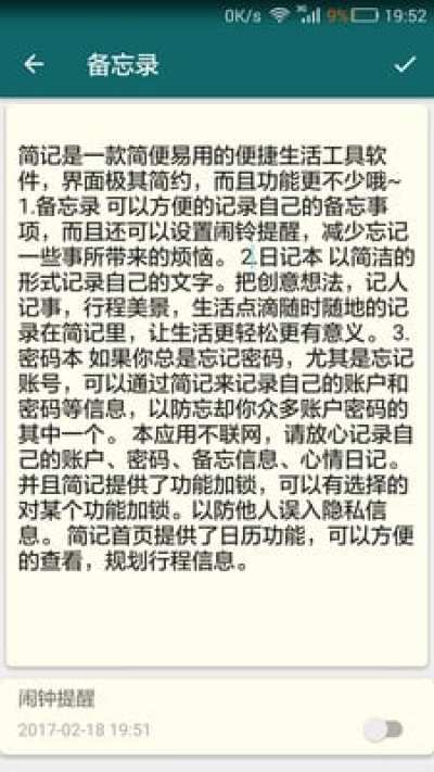 可以方便的记录自己的备忘事项,而且还可以设置闹铃提醒,减少忘记一些事所带来的烦恼。