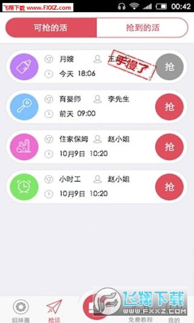 -抢活儿:凡是通过免费能力认证的姐妹,都可以免费找活儿,不收任何费用,都什么时代了,姐妹们再也不需要家政中介寄生虫!