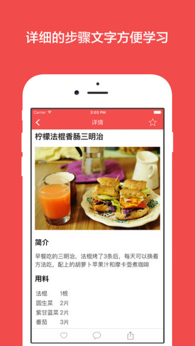1、步骤详细:超详细的使用工具、所需食材、步骤图示,让你零失败的走入厨房世界。
