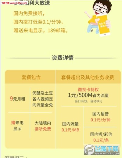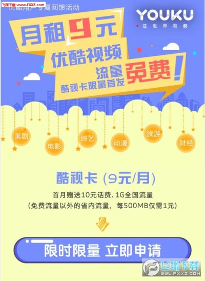 酷视卡套餐是中国电信为满足互联网视频用户需求,与优酷视频联合推出的视频合作套餐。该套餐月租仅需9元,用户可享受优酷视频省内定向流量免费,赠送来电显示和189邮箱等。2017年3月24日-2017年9月23日期间,订购的用户还可0元入网,订购当月赠送10元话费,获赠送1G全国流量哦,喜欢看视频的用户赶快行动吧!