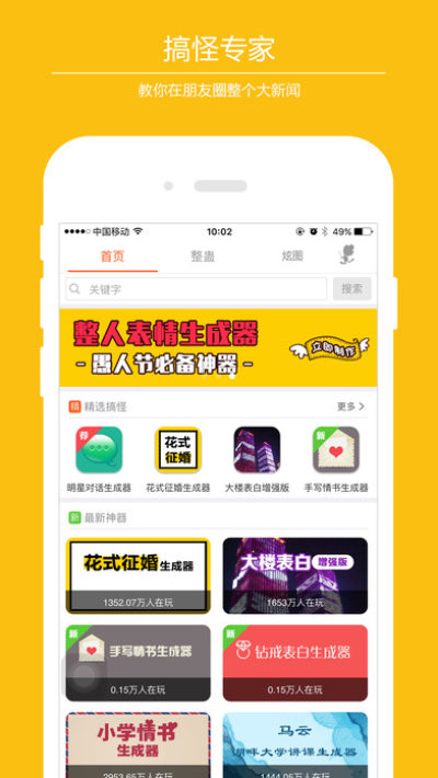 搞怪专家,助你一键生成各种整蛊,炫图,各种神P图一键自动生成!将这些图片分享到社交网络,分分钟能搞个大新闻!