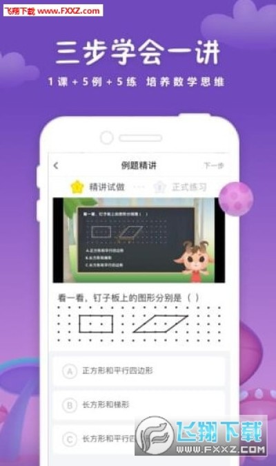 每个知识的学习包含3步,1段5分钟左右的动画视频,5道由浅及深的经典例题,以及5道精选练习题。