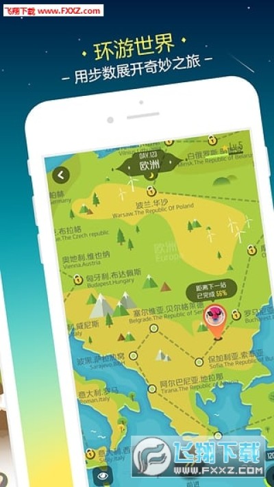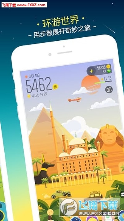- 使用计步器功能记录你的步数 ,步数会被转换成环游世界所需的能量值,消耗能量来获得前进的动力。