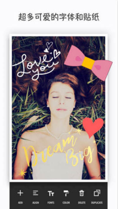 - 多样素材:100+创意贴纸70+最新字体让你的图片会说话。创新个性是一种追求。