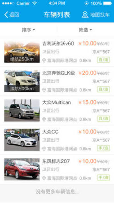 5、租赁用户通过手机APP查询、预订所有在线运营的租赁公司,而不只是一家租赁公司,便于比价等