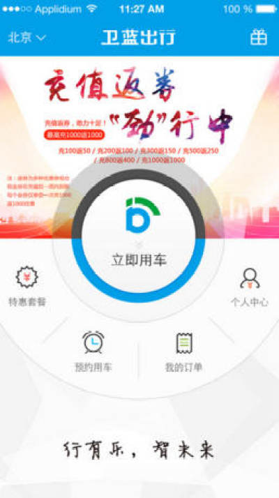 1、卫蓝出行电动汽车商业模式,提供分时租赁、自助取/还车、免押金租车服务;