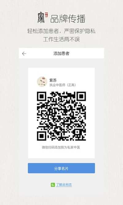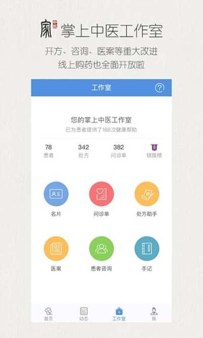 您的掌上中医工作室,帮助您进行患者管理,打造个人品牌,体现医生的价值,提供六大工具涵盖:名片,问诊单,处方助手,我的患者,医案,手记。
