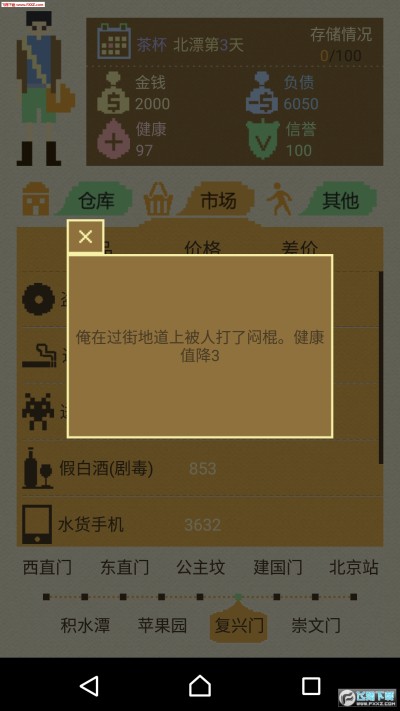 扮演一位从外地到北京谋生的青年。一开始,你只有2000元钱,并且还欠村长(一个流氓头子)5000元债务。这些债务每天的利息高达10%。如果不及时还清,村长会叫在北京的老乡们来扁你,你可能牺牲在北京街头。你决定在北京地铁各黑市倒卖各种物品来发财致富,不仅还掉债务,而且要荣登北京富人排行榜。你只能在北京呆40天,每次奔走一个黑市算一天。一开始,你租的房子只能放100个东西。 你会在北京遭遇到各种事件,让你感到北京浮生之艰难,世态之炎凉、我们这个时代强烈的荒谬感。
