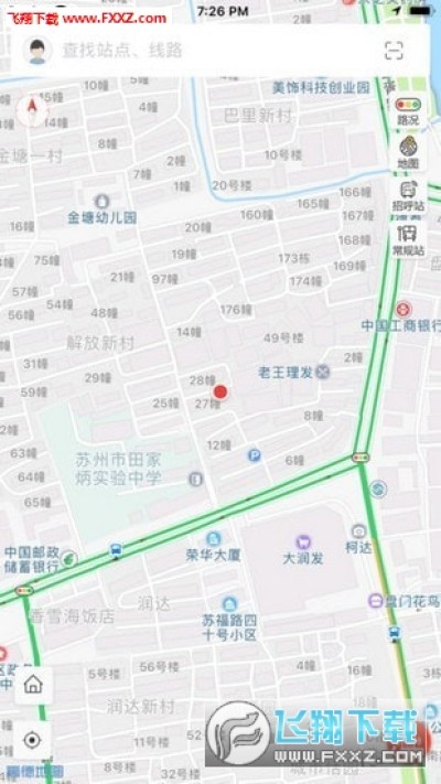 点击首页的“我要出行”,出现了一张地图,点击地图右上方的“路况”“地图”“常规站”“招呼站”,可以分别显示用户当前位置附近的路况、影像地图、常规公交站点(红色圆点)和微巴站点(黄色圆点)。
