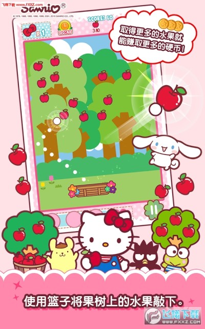 - 您可以升级并装备8位Hello Kitty角色,升级果篮和皮球让他们成为采集果实的最佳工具