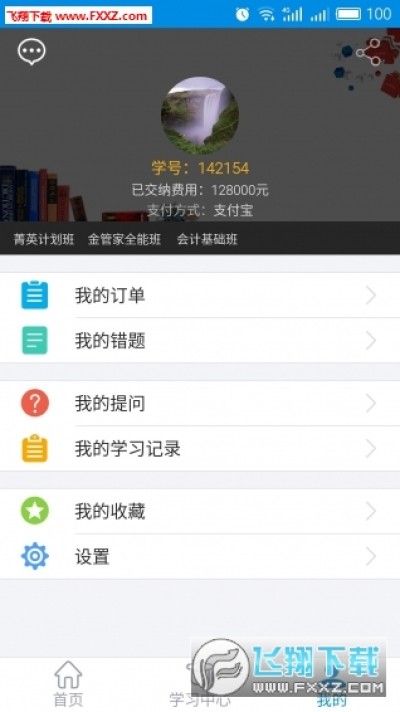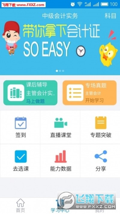 仁和会计课堂主要由首页、学习中心、我的三部分组成。