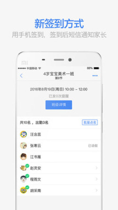 - 点名签到:可在手机上进行点名,签到后自动短信通知家长