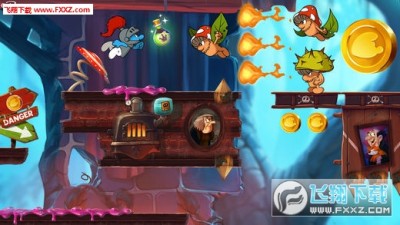 蓝精灵纵情快跑手游安卓版游戏中玩家除了要赶紧逃离浓雾外,也必须搜集各地的道具来解救其他的小精灵。游戏以 2D 横版跑酷的形式呈现,玩家要帮助可爱的蓝精灵们不断躲避障碍、收集金币,还要把被困起来的其他蓝精灵全部解救出来才算闯关成功。画面和动画片里的一样,明亮鲜艳的卡通风格,在丰富的场景中玩家将可以看到熟悉的蘑菇小屋、矿山、森林,和格格巫的城堡。配乐也非常的轻松活泼,让人不知不觉就沉浸在这个童话故事里。