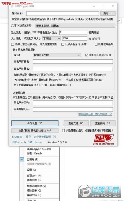 支持设置冲突解决方案,支持延迟复制,支持扩展名黑白名单,支持磁盘分区号/序列号黑名单,支持日志,支持弹出U盘时强制停止复制防止占用,支持文件大小限制