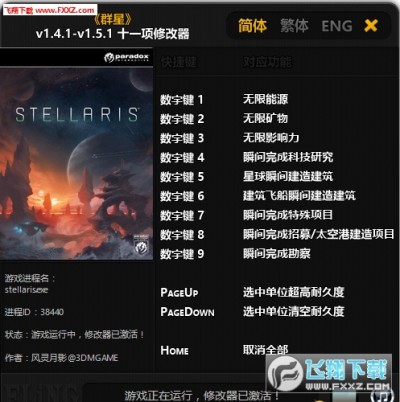 群星 v1.4.1-v1.5.1 十一项修改器,这款修改器一共拥有着无限能源、无限矿物、无限影响力、瞬间研发等等超强大的功能,感兴趣的玩家小伙伴快来下载尝试哦!