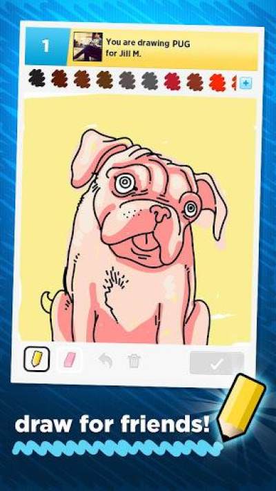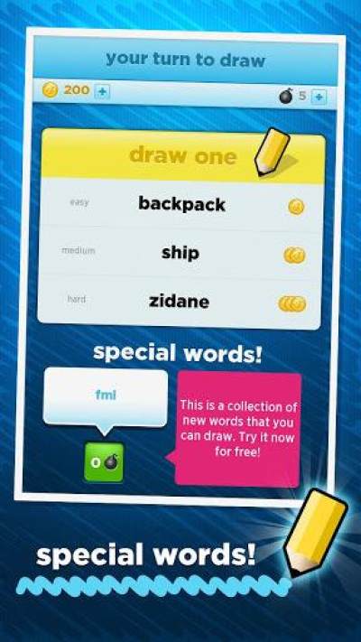 风靡欧美的你画我猜游戏。近期美区App Store榜首的应用安卓版。有点类似于你画我猜一类的游戏,将玩家可从三个备选词中选择一个画一幅画,然后发送给好友猜是描述什么单词,猜对便能和对方一起获得金币。玩家可选择Facebook或邮箱登陆,使用Facebook的玩家能方便邀请身边的朋友一起玩。此外,游戏中赚得的金币能用于购买道具或颜色,让玩家能更创作更形象的图画。