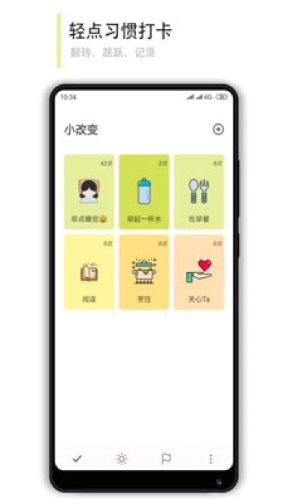【小改变】是一款简洁的习惯打卡应用,个性化的设置将你的习惯仪式化。它会提醒你,激励你,然后轻轻一点,就完成了你的习惯记录。